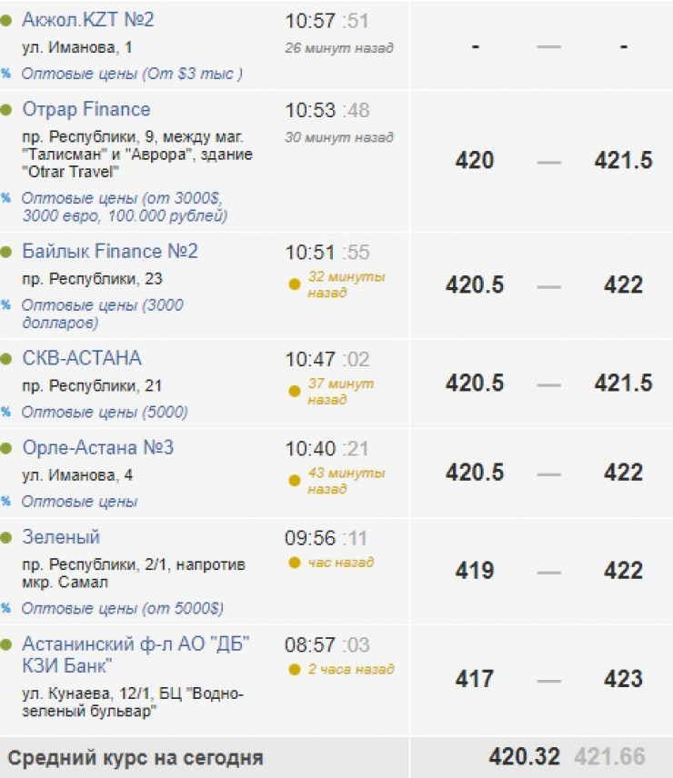 В обменных пунктах Нур-Султана американскую валюту продают по 421,4-423, покупают по 417-420,5 тенге.