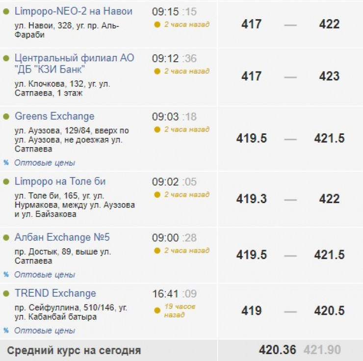По данным Kurs.kz, в обменниках Алматы курс продажи доллара колеблется от 420,5 до 423 тенге, курс покупки - от 417 до 421 тенге.