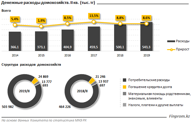 Расходы казахстанских семей во II квартале 2019 года составили 543,3 тысячи тенге, это на 8,6 процента больше, чем год назад. Таким образом, в среднем доходы домохозяйств растут быстрее их расходов.