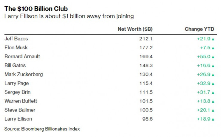 Шестую и седьмую строчки списка BBI занимают основатели Alphabet Ларри Пэйдж и Сергей Брин, их состояние насчитывает 115 и 111 миллиардов соответственно. На восьмом месте находится американский инвестор Уоррен Баффет с состоянием в 101 миллиард. Закрывает десятку основатель Oracle Ларри Эллисон, единственный из топ-10, чье состояние не достигло 100 миллиардов долларов.