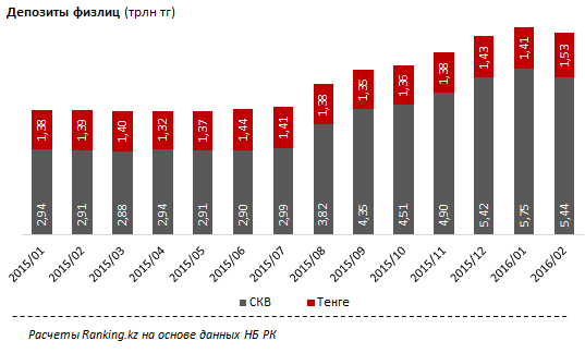 За февраль 2016 года рынок тенговых вкладов населения вырос на 8 процентов, до 1,53 триллиона тенге, а в долларах сократился на 5 процентов, до 5,44 триллиона тенге. К такому выводу пришла аналитическая служба Ranking.kz.