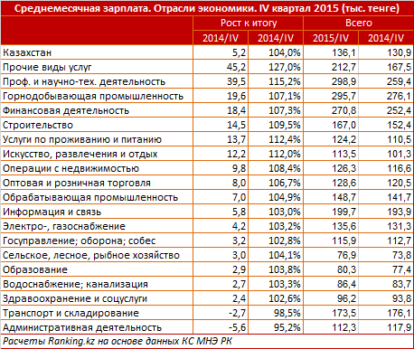 Среди видов деятельности по приросту зарплат с большим отрывом лидируют так называемые "прочие услуги" - на 45,2 тысячи тенге, или на 27 процентов за год. Преуспели также специалисты, занимающиеся профессиональной, научной, технической деятельностью - их средний заработок за год вырос на 39,5 тысячи тенге или на 15 процентов. Финансисты и работники горнодобывающей промышленности получили прибавку в размере 18-20 тысяч тенге, строители - 14,5 тысячи, трудящиеся в сфере услуг по проживанию и питанию - 13,7 тысячи.