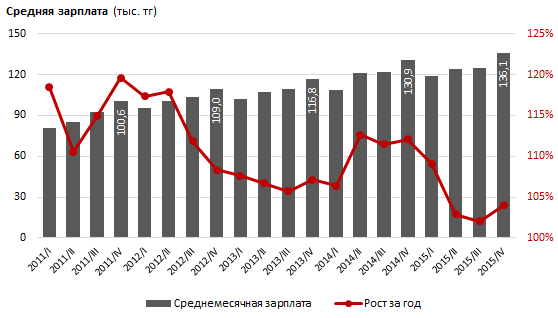По данным аналитиков, заработная плата казахстанцев за 2015 год в среднем выросла на четыре процента при уровне инфляции в 13,6 процента. Среднемесячная зарплата в четвертом квартале 2015 года в Казахстане составила 136,1 тысячи тенге. Это на 5,2 тысячи больше, чем в 2014 году. Как сообщили эксперты, в прошлом году темпы роста средней зарплаты показывали наименьшие за последние пять лет значения, уступая уровню инфляции.