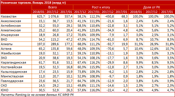 В январе объемы розничной торговли достигли 625,7 миллиарда тенге - на 12,5 процента больше, чем в аналогичном периоде годом ранее (и на 4,3 процента больше в реальных объемах, с учетом инфляции). Самый большой годовой рост отмечен в Алматинской области - на 23,6 процента, до 25,2 миллиарда тенге. На втором месте - Карагандинская область, плюс 16,2 процента за год, до 61,7 миллиарда тенге, на третьем месте - ЮКО, плюс 16 процентов, до 30,5 миллиарда тенге.