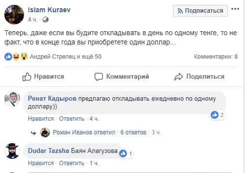 Начальник управления по защите прав потребителей финансовых услуг и внешних коммуникаций Национального Банка Александр Терентьев на своей странице в Facebook призвал казахстанцев в связи с этим "не рвать рубашки".