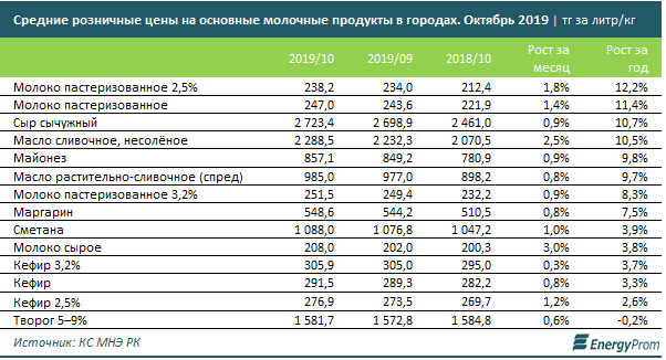 Так, пастеризованное молоко за год подорожало сразу на 12,2 процента. Теперь оно стоит 238,2 тенге за один литр. Больше чем на 10 процентов за год выросли в цене сычужный сыр (плюс 10,7 процента, до 2,7 тысячи тенге за килограмма) и сливочное масло (плюс 10,5 процента, до 2,3 тысячи тенге за килограмм).