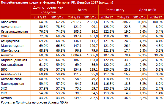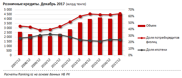 Более трех четвертей прироста портфеля розничных кредитов приходятся на потребительские займы физлиц, которые увеличились за 2017 год на 15,3 процента, или 386,2 миллиарда тенге, до 2,9 триллиона тенге. Их доля в общем объеме кредитов физлиц выросла за год с 62,7 процента до 64,3 процента. Также на результат повлиял рост ипотечных кредитов на 11,5 процента, или 113,2 миллиарда тенге, до 1,1 триллиона тенге.