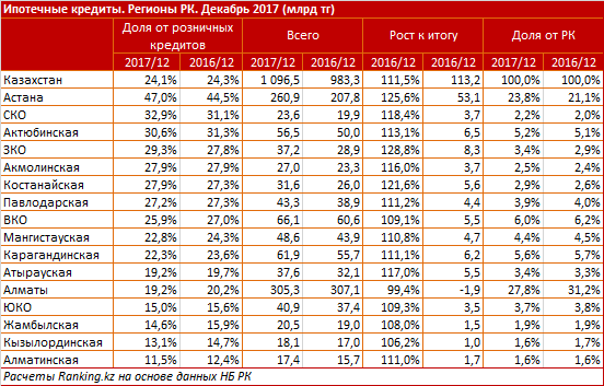 Также в тройке лидеров Актюбинская область, с долей ипотечных кредитов от общего объема розничных займов 30,6 процента. Объем вырос на 13,1 процента (6,5 миллиарда тенге), до 56,5 миллиарда тенге. Доля от РК выросла с 5,1 процента до 5,2 процента.