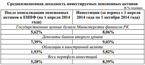 Ранее на сайте регулятора сообщалось, что в 2014 году, согласно новой инвестиционной декларации ЕНПФ, инвестиции осуществляются в основные три группы активов: государственные ценные бумаги Министерства финансов, депозиты и облигации банков второго уровня Казахстана и еврооблигации международных эмитентов.