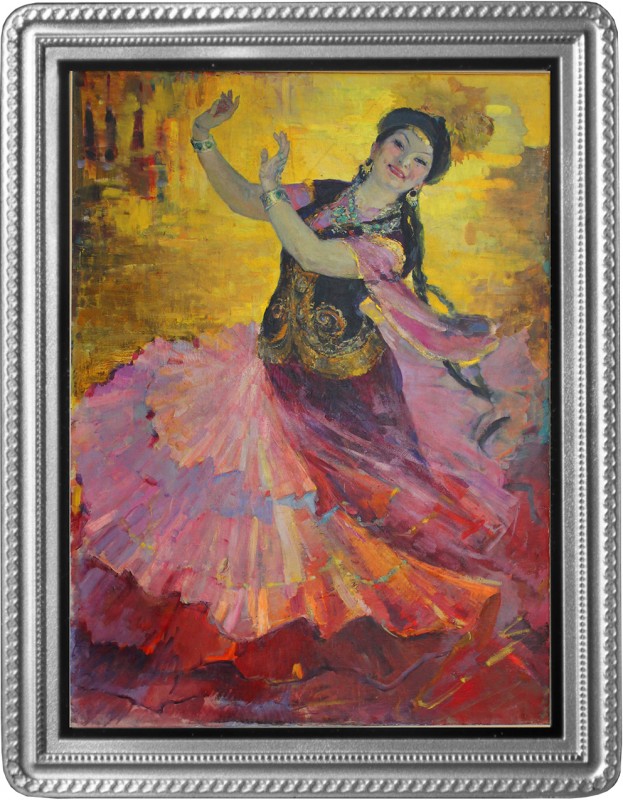 На реверсе монеты - картина художницы Гульфайрус Исмаиловой "Казахский вальс" (Государственный музей искусств Республики Казахстан им. А. Кастеева), на которой изображена казахская танцовщица, Народная артистка Казахской ССР Шара Жиенкулова. Цветовое решение выполняется посредством технологии тампопечати".