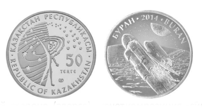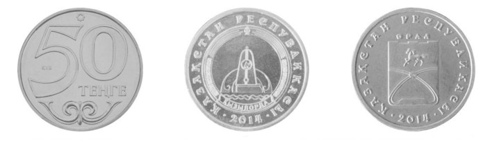 Памятные монеты выполнены из сплава нейзильбер: "Тайказан" из серии монет "Сокровища степи", "Буран" из серии монет "Космос", "Кызылорда" и "Орал" из серии монет "Города Казахстана" номинальной стоимостью 50 тенге.