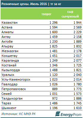 По информации аналитиков, розничные цены на творог по итогам июля выросли на 21,1 процента, до 1 296 тенге за килограмм, на сычужный сыр - на 17,6 процента, до 1 944 тенге за килограмм.