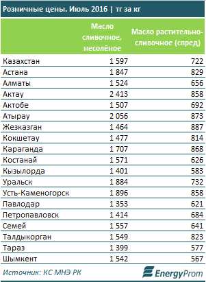 Дороже всего творог стоил в Атырау (1 825 тенге за килограмм), сыр - в Астане (2 569 тенге за килограмм). В свою очередь, розничные цены на сливочное масло выросли за год на 20,2 процента, до 1 597 тенге за килограмм. Сливочное масло дороже всего стоило в Актау - 2 413 тенге за килограмм.