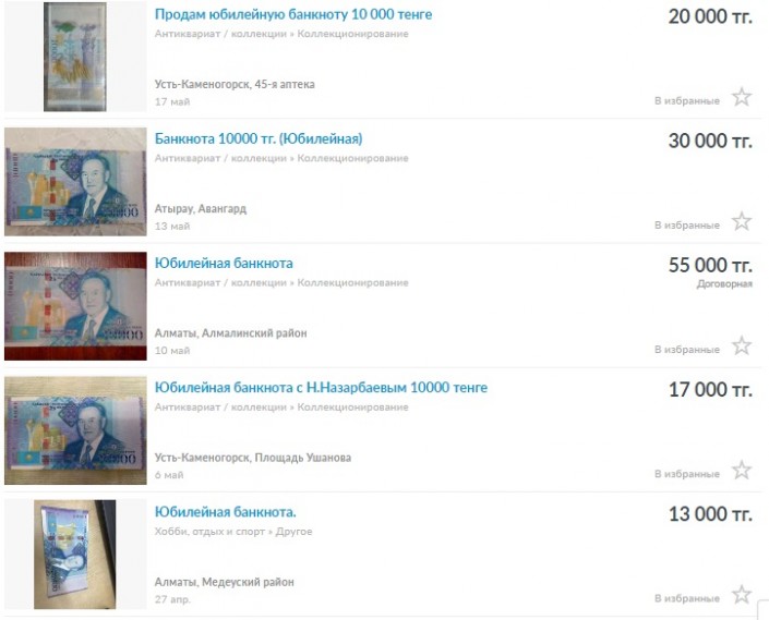 Стоимость юбилейной купюры на сайте Olx.kz варьируется от 13 до 55 тысяч тенге.