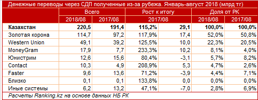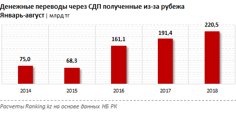 Издание дает сведения за январь-август 2018 года. Объем полученных физлицами из-за рубежа денежных переводов, совершенных через СДП, составил 220,5 миллиарда тенге. Это на 15,2 процента больше, чем за аналогичный период прошлого года. Несмотря на увеличение объема, темпы роста сокращаются второй год подряд. Годом ранее прирост в аналогичном периоде составлял 18,8 процента, еще раньше рост был в 2,4 раза.
