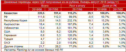 Среди стран, откуда были произведены переводы, лидирует Россия - 111,8 миллиарда тенге. Следом идет Южная Корея - 33,6 миллиарда тенге. Замыкает тройку лидеров Кыргызстан - 18,4 миллиарда тенге.