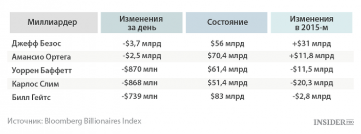 Больше всего потерял в первый день торгов 2016 года основатель Amazon Джефф Безос. Он лишился 3,7 миллиарда долларов, когда акции крупнейшего в мире онлайн-ритейлера подешевели на 5,8 процента. Теперь собственный капитал Безоса составляет 56 миллиардов долларов.