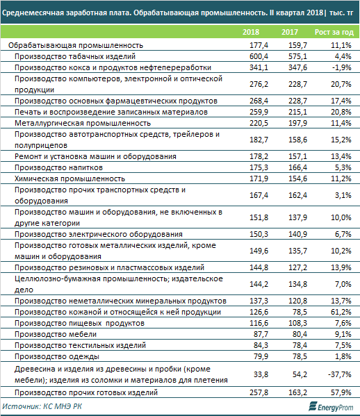 Среднемесячные заработные платы в сфере переработки достигли во втором квартале 2018 года 177,4 тысячи тенге (+11,1 процента год-к-году и +4,6 процента с учетом инфляции).