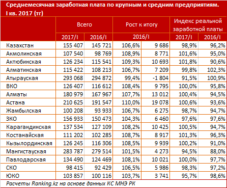 По итогам 1 квартала 2017 года среднемесячная зарплата казахстанских работников крупных компаний выросла быстрее, чем у остальных сотрудников, сообщает Ranking.kz. По итогам 1 квартала 2017 года среднемесячная заработная плата казахстанцев составляла 140,3 тысячи тенге, что на 5,6 процента выше, чем в аналогичном периоде годом ранее. В то же время для сотрудников крупных и средних предприятий этот показатель достигал 155,4 тысячи тенге - на 6,6 процента больше, чем годом ранее.