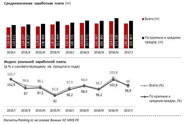 Примечательно, что хотя номинальные зарплаты работников больших компаний всегда были выше среднего по стране, ранее их покупательская способность снижалась сильнее и увеличивалась медленнее, чем в среднем по РК (102,6 процента против 103,8 в прошлом квартале и 96,2 против 97,3 процента в 1 квартале 2016).