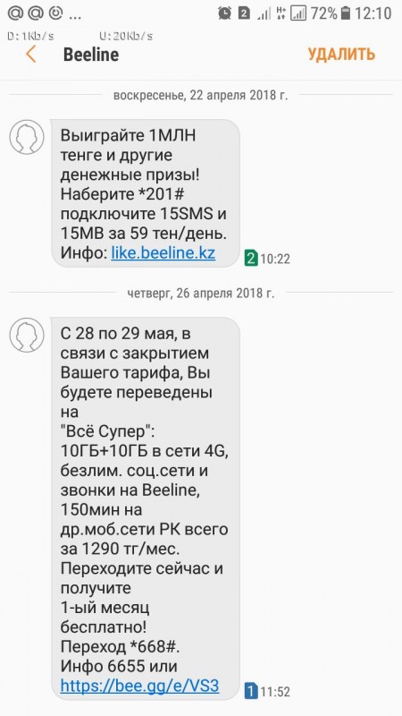 "Только что получила смс от Билайна, что с 28 по 29 мая мой тариф будет закрыт и переведен на тариф "Все супер". Но дело в том, что мобильным интернетом я пользуюсь очень редко, а по телефону говорю максимум пять-десять минут в месяц. Зачем мне платить 1290 тенге в месяц?" - пишет другой клиент в Facebook.