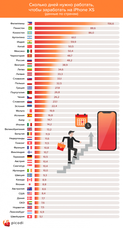 Ресурс отмечает, что их статистика основана на официальных данных о среднестатистической заработной плате в каждой стране, а также на уже опубликованных ценах на смартфоны iPhone Xs с памятью 64 Гб.