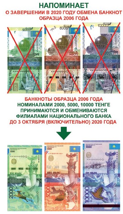 Национальный банк Казахстана напомнил о завершении обмена банкнот образца 2006 года, передает Тengrinews.kz.