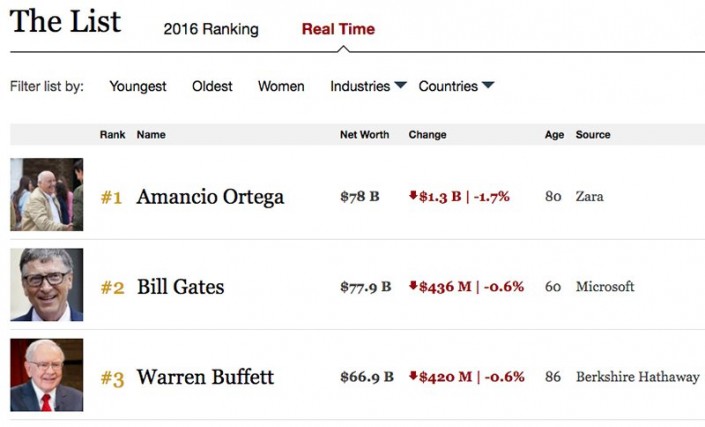 80-летний испанский миллиардер Амансио Ортега, основавший компанию Inditex (бренды Zara, Pull&Bear, Bershka и Massimo Dutti), стал самым богатым человеком на планете. На этой неделе акции его компании выросли в цене на 1,7 миллиарда долларов, а состояние достигало отметки в 79,5 миллиарда долларов по версии журнала Forbes.