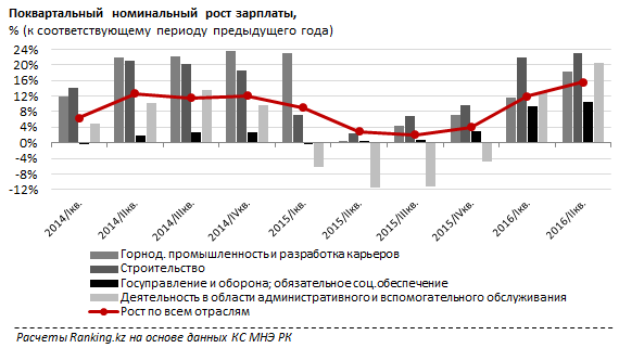 "Основной вклад в увеличение средней заработной платы за два прошедших года внесли, ожидаемо, строительный сектор (+14,51 процента) и горнодобывающая промышленность (+14,47 процента). При этом по сравнению со вторым кварталом 2015 рост зарплат в строительстве оказался четвертым среди всех 19 видов экономической деятельности (вперед вырвались научная и техническая деятельность, финуслуги и образование), тогда как горнодобывающая промышленность, в основном в связи с падением цен на сырье, по темпам роста оказалась лишь седьмой", - привели такие данные специалисты.