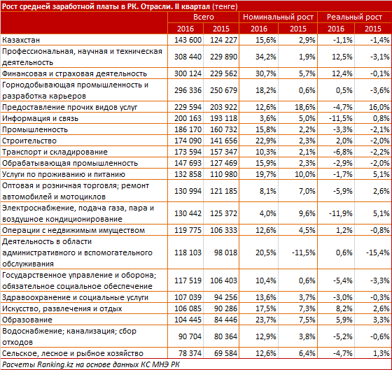 По информации аналитиков, средний заработок наемных работников в Казахстане по итогам второго квартала 2016 года составил 143 600 тенге. По итогам шести месяцев 2016 года среднее значение заработной платы по стране продемонстрировало наибольший квартальный рост, начиная с четвертого квартала 2014 года. Итоговой рост номинального заработка составил почти 15,6 процента, при этом, начиная с 2014 года, заработные платы росли в среднем на 8,8 процента в годовом исчислении.