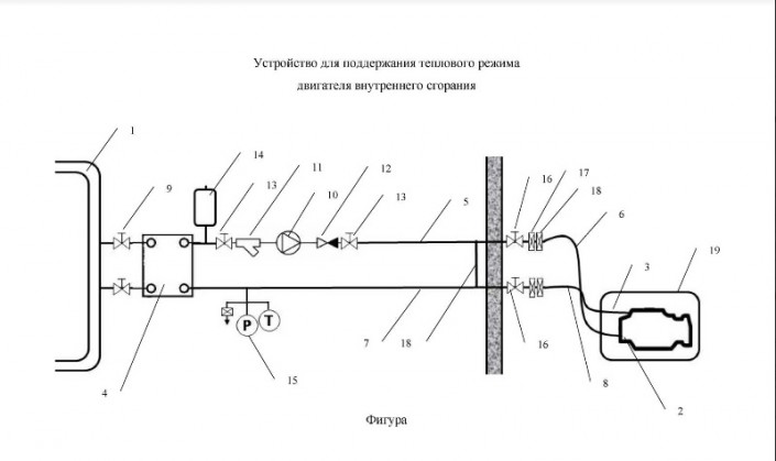 Устройство для поддержания теплового режима двигателя внутреннего сгорания содержит систему прогрева жидкости с теплообменников, которая содержит входной трубопровод, соединяющий рубашку охлаждения двигателя с теплообменником, и выходной трубопровод, соединяющий теплообменник с головкой блока цилиндров через рубашку охлаждения двигателя. Теплообменник подсоединен к магистральной теплосети отапливаемого объекта с терморегулятором, причем входной и выходной трубопроводы со стороны внутреннего помещения выполнены из металлических труб, а с внешней стороны - из гибких шлангов.