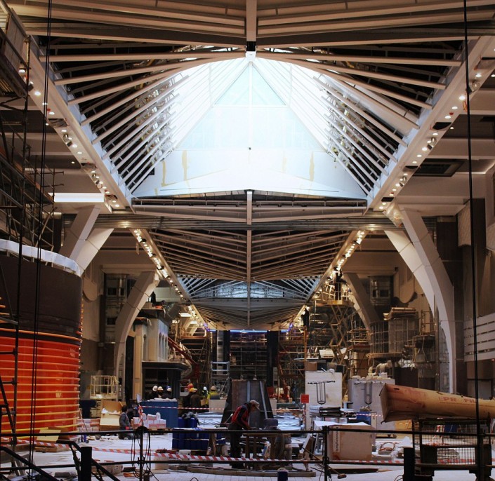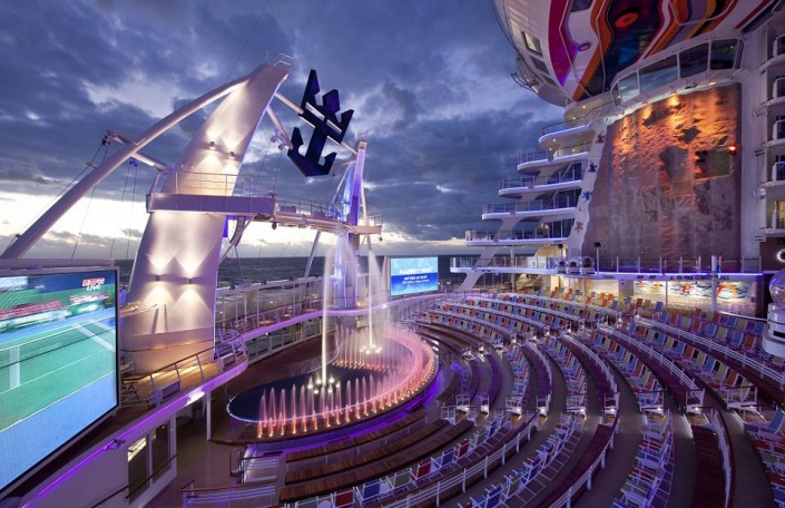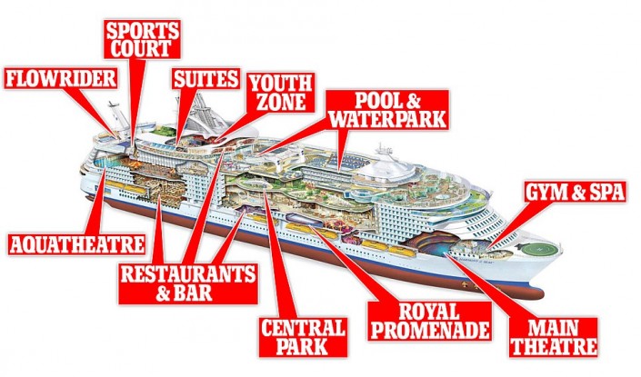 На борту гиганта будут работать 40 ресторанов и десятки магазинов, театр на 1400 мест, бассейны с генераторами волн, мини-поле для гольфа, площадка для игры в баскетбол, многочисленные сауны и водная горка через все палубы, которая является самой длинной на аналогичных лайнерах.