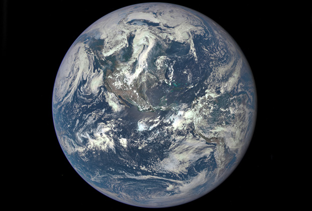 На снимке видно Западное полушарие Земли, в частности Северная и Южная Америки и окружающие их Тихий и Атлантический океаны. В его центре заметны бирюзовые пятна, отвечающие мелководным морям вокруг островов Карибского бассейна. Изображение получено монтированием трех высококачественных снимков, полученных 6 июля 2015 года с расстояния около 1,6 миллиона километров от планеты камерой EPIC (Earth Polychromatic Imaging Camera) аппарата DSCOVR.