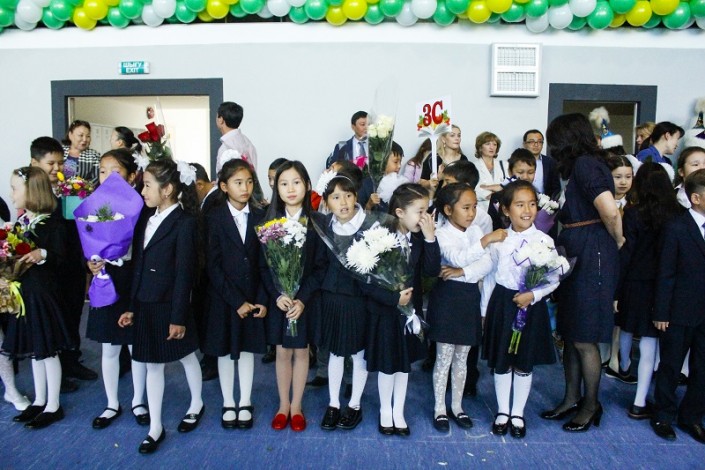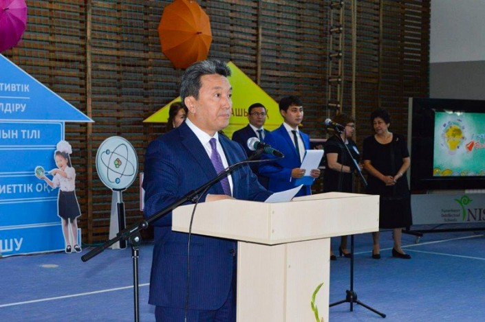 Линейка, посвященная началу учебного года, началась символично - с торжественного вручения ключа школы руководителем проекта строительства НИШ Жанабилом Байжигитовым директору школы Бауыржану Узакбаеву. Группа иностранных преподавателей школы удивила гостей своими вокальными выступлениями, и более всего детей впечатлило исполнение ими казахских песен.