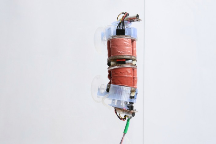 Каждая секция может сжиматься, что позволяет роботу сгибаться и даже ползти. С помощью присосок он может прикрепляться и к стенам.