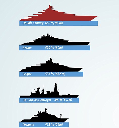 Длина судна составит 656 футов (200 метров или два футбольных поля), высота - 88 футов (26 метров). Яхта с девятью палубами строится по проекту известного корабельного дизайнера Кристофера Сеймура. Цена Double Century - 770 миллионов долларов.