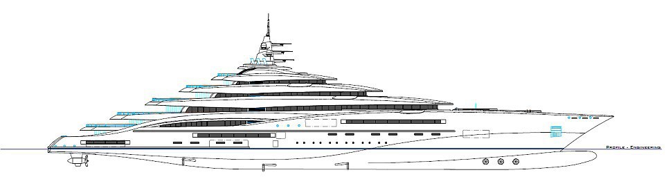 На яхте будут две вертолетные площадки, мини-субмарина. Двигатели мощностью 94 тысячи лошадиных сил смогут разогнать судно до 30 узлов в час (около 56 километров в час).