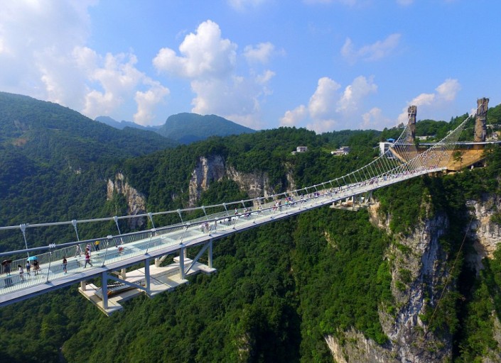 Пешеходный мост соединяет два горных утеса в национальном парке Чжанцзяцзе, где проходили съемки фильма "Аватар". Длина моста составляет 430 метров, ширина - шесть метров, высота - 300 метров над землей.