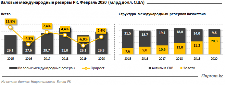 Казахстан наращивает объемы золота и снижает запасы иностранной валюты. Международные резервы страны на конец февраля 2020 года составили 29,9 миллиарда долларов - на 2,6 процента больше, чем в аналогичном периоде прошлого года (29,1 миллиарда долларов), и на 1,9 процента больше, чем в январе текущего года, передает Tengrinews.kz со ссылкой на Finprom.kz.
