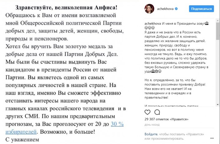 В свою очередь, на своей странице в Instagram Анфиса Чехова ответила, что хотя и разделяет желание защищать интересы детей, женщин, пенсионеров, но в политику женщину никогда не тянуло.