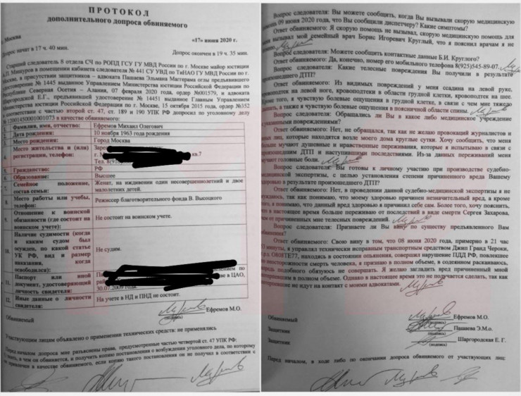 В распоряжение редакции канала попал протокол дополнительного допроса Ефремова следователем 17 июня. Под ним стоит в том числе подпись адвоката актера Эльмана Пашаева.