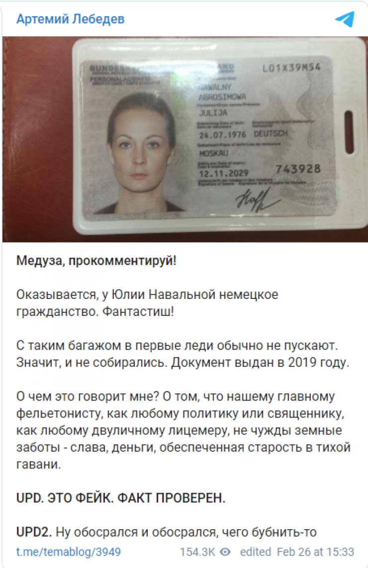 Фотография, на которой якобы изображено удостоверение гражданина ФРГ, выданное на имя Юлии Навальной, Артемий Лебедев опубликовал у себя в Telegram-канале 25 февраля.