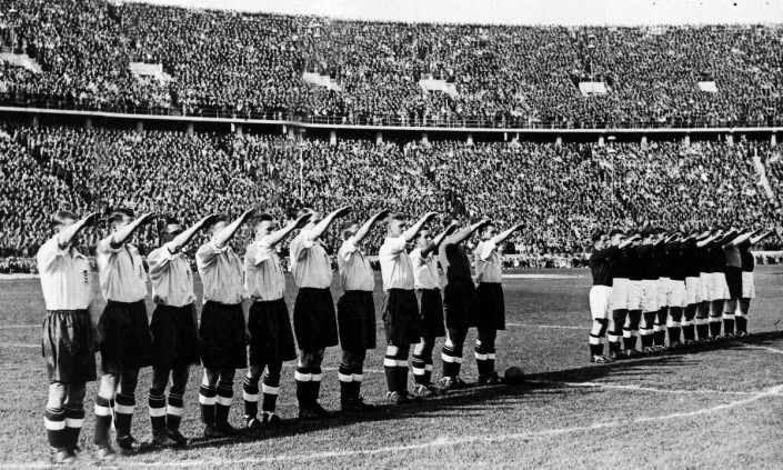 Черно-белый снимок, о котором идет речь, был сделан 14 мая 1938 года в Берлине. На нем английские футболисты приветствуют немецкую команду нацистским жестом перед товарищеским матчем против сборной Германии.