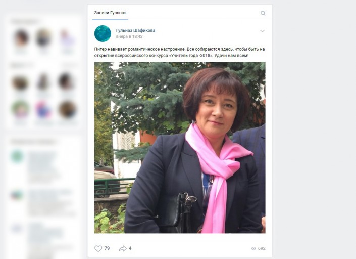 "Питер навивает романтическое настроение. Все собираются здесь, чтобы быть на открытие всероссийского конкурса "Учитель года - 2018". Удачи нам всем!" - написала Шафикова.
