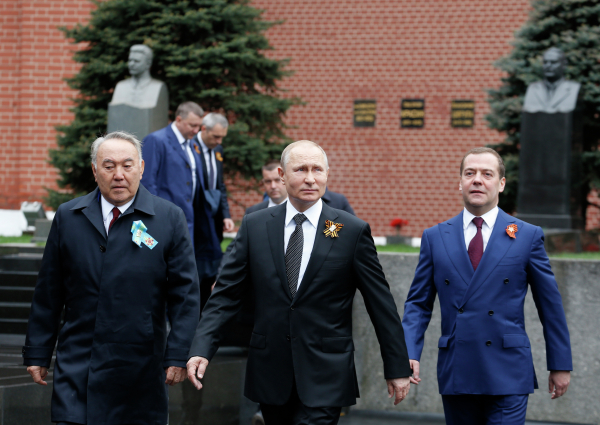 На главную трибуну в Москве Нурсултан Назарбаев вышел вместе с президентом России, верховным главнокомандующим Владимиром Путиным и премьер-министром РФ Дмитрием Медведевым.