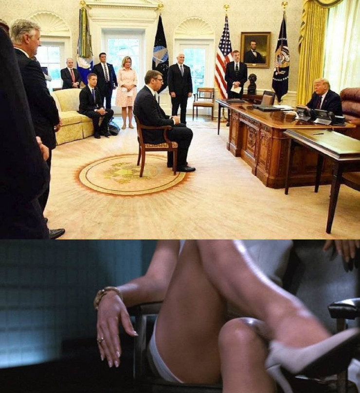 4 сентября Вучич встретился с Трампом в Вашингтоне. Одну из фотографий с этой встречи прокомментировала Мария Захарова. Она сравнила переговоры в Белом доме с допросом, разместив фотографию встречи Вучича с Трампом рядом с кадром из фильма "Основной инстинкт".