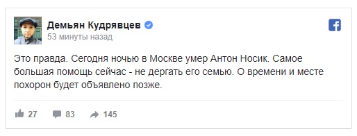 Смерть наступила в районе двух часов ночи. Другие подробности пока не приводятся. Информацию о смерти подтвердил член совета директоров газеты "Ведомости" Демьян Кудрявцев. Жена блогера сообщила RT, что у Носика произошла остановка сердца. "Это произошло у друзей на даче. Сейчас он находится в Мытищинском морге", - рассказала она.
