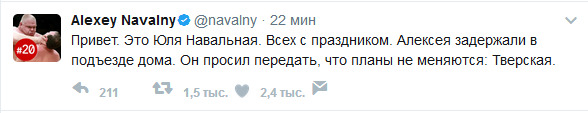 "Привет. Это Юля Навальная. Всех с праздником. Алексея задержали в подъезде дома", - написала она в понедельник в аккаунте Навального в соцсети Twitter.