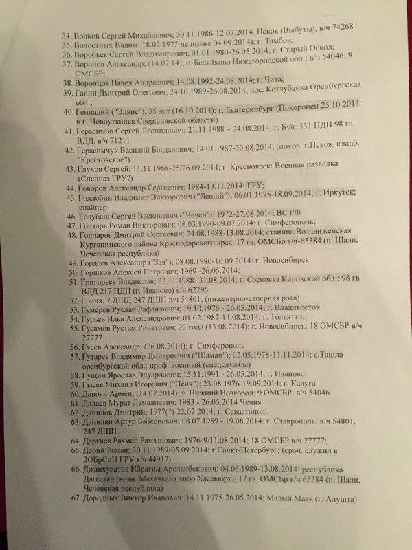 В представленном списке 227 фамилий. При этом сообщается, что "смерть многих людей из списка подтверждается открытыми источниками". Так, по словам специального корреспондента ИД "Коммерсантъ" Ильи Барабанова, который неоднократно ездил в командировки в Донбасс и занимался расследованием смертей россиян на этой войне, "в этом списке очень много знакомых фамилий, некоторые проходили по СМИ и соцсетям".