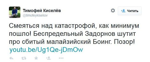 Пользователи социальных сетей активно обсуждают шутку известного российского юмориста Михаила Задорнова о сбитом над Украиной малайзийском Boeing-777, сообщает "Русская служба Би-би-си".